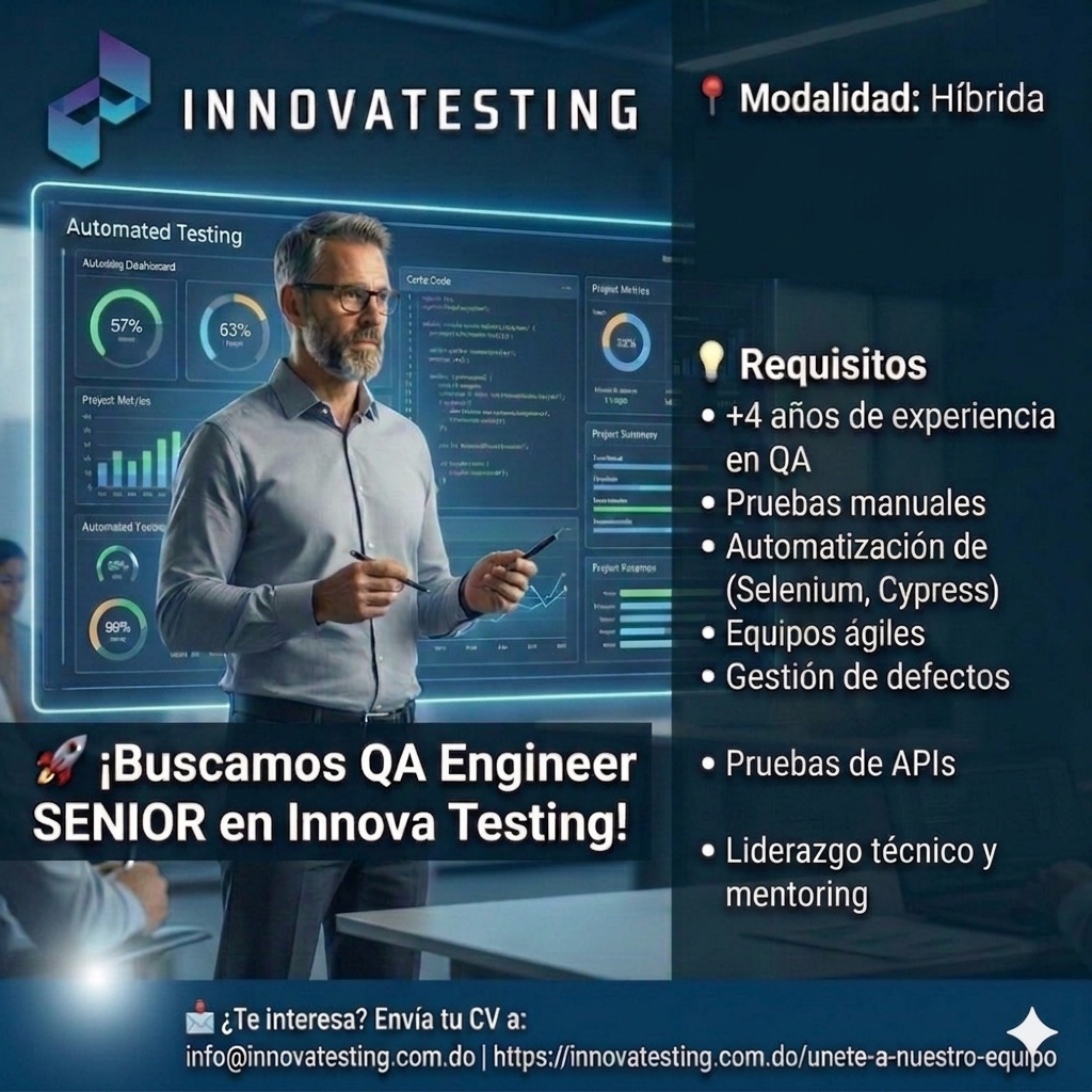 En Innova Testing, no solo probamos software, probamos nuevas formas de crecer, colaborar y evolucionar como equipo. Somos una empresa dominicana enfocada en ofrecer soluciones de calidad en aseguramiento de software (QA), apostando por la innovación, la mejora continua y el talento humano como nuestro mayor diferenciador.